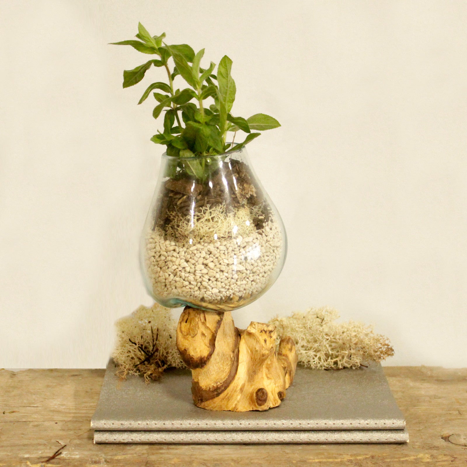 Sticlă topită pe lemn - Bol mediu, este suflat manual și, în timp ce este încă fierbinte, este apoi relaxat peste o bucată de rădăcină Gamal, apoi sticla se întărește la forma lemnului asigurând o potrivire perfectă. Realizata folosind un produs natural, folosind unelte de mână în mod tradițional balinez. Oferă un cadru unic pentru pietre și plante de aer, flori tăiate, un rezervor de pește sau un decantor de vin. Fiecare articol este unic, deoarece este fabricat din lemn Gamal natural, durabil, iar sticla reciclată are o formă potrivită, ceea ce îi sporește autenticitatea. Ele pot fi folosite pentru plante de casă, grădini zen, boluri de pește sau lumânări plutitoare.